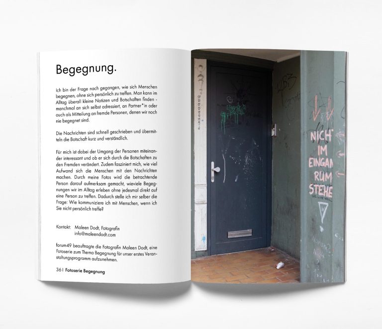 Für das erste Programmheft von forum49 entstand diese Serie als visuelle Auseinandersetzung mit alltäglichen, indirekten Begegnungen. Im Zentrum des Heftes ist ihr ein eigener Bildraum gewidmet, der sich über mehrere Seiten erstreckt.
